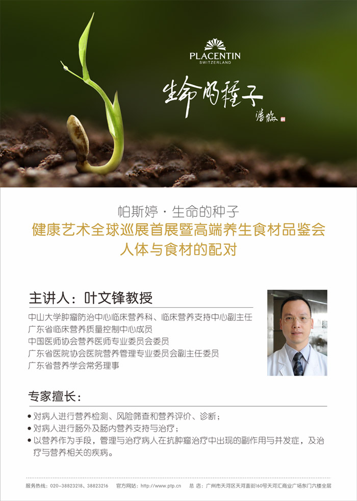 營養(yǎng)學是一門科學,人體就像藝術一般,是人體與食材的完美對應,亦是維持健康與生命質量的希望“種子”!7月11日,帕斯婷將舉辦健康藝術全球巡展首展暨高端養(yǎng)生食材品鑒會,并邀請國內知名臨床營養(yǎng)專家葉文鋒教授獻上精彩的營養(yǎng)講座。讓健康營養(yǎng)膳食成為一種享受型的生活藝術,讓我們每一秒種都充滿生機!