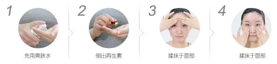 油性、混合性、中性皮膚可直接使用再生素。每晚潔膚爽膚后取適量再生素按皮膚生長(zhǎng)紋理均勻涂抹于臉部及頸部至皮膚完全吸收為止。干性與敏感性皮膚,可適當(dāng)調(diào)和調(diào)配乳液使用。或以1:2份量調(diào)和使用。注意避免入眼,盡量避免臉部過(guò)度表情動(dòng)作影響祛皺效果。